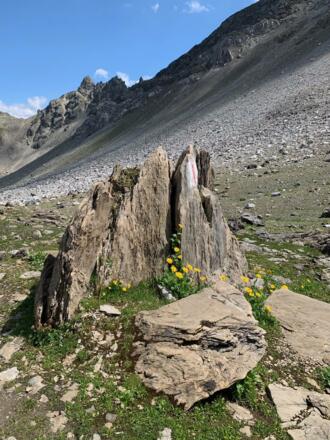 Hier erlebst Du Erdgeschichte zum Angreifen. Du wanderst entlang der Grenze zwischen dunklem Gneis und hellem Kalkstein. Der jüngere Kalkstein aus dem Penninischen Ozean wird dabei von älteren Gesteinsschichten überlagert. In der Auffaltung der Alpen wurde dabei diese tiefer liegende Kalkschicht nach oben gedrückt und durch Gletscher und Erosion freigelegt.