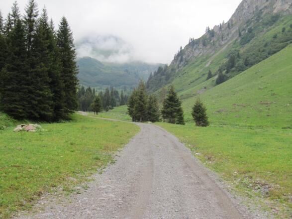 Von Rells südlich hinauf, anfangs gemütlich, später etwas steiler. Bei der unteren und oberen Zaluanda-Alpe vorbei bis zum Schweizer Tor, durch das Schweizer Tor hindurch auf die schweizer Seite wechseln. Hier führt ein steiler Weg, teils mit Seilversicherung und einer Leiter, hinunter.
