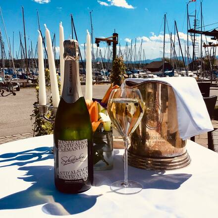 Geniessen Sie den atemberaubenden Blick über die Terrasse auf den Hafen am Chiemsee, oder entspannen Sie sich in den kalten Wintermonaten bei excellenter Kulinarik am offenen Kamin.