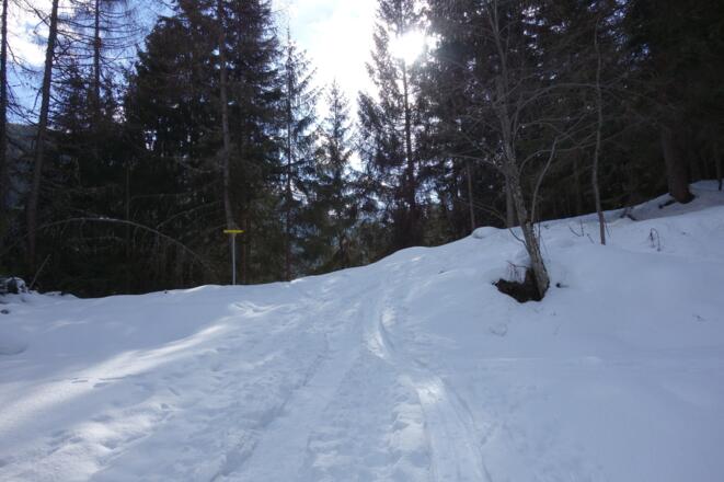 Abfahrt: Das schöne Gelände Richtung Senderstal bietet viel Platz. Wir erreichen durch breite Schneisen die Salfeinsalm. Bei sicheren Verhältnissen kann weiter über die Schneisen ins Senderstal abgefahren werden, sonst sollte besser der Forstweg benützt werden. Am Talgrund errreichen wir die Rodelbahn, die zur Kemateralm führt und fahren auf dieser zurück bis zu ihrem Ende. Bei einem markanten neuen Gebäude zweigt der Steig Richtung Sportplatz - Tanneben ab, der fast eben zurück zum Parkplatz führt.