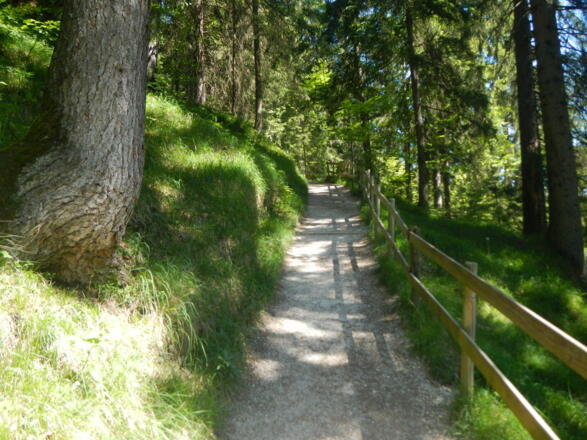 Die neunte Etappe des SalzAlpenSteigs vom Bergsteigerdorf Ramsau bis zum Königssee hat ihren Startpunkt bei der Gemeindeverwaltung/Tourist-Information Ramsau. Zuerst Richtung Westen entlang der Hauptstraße dem Verlauf der Ramsauer Ache folgend. Vor der Kirche biegen wir rechts in den Schluchtweg hinein. Der Weg führt uns stetig bergauf, bis wir nach ca. 250 Höhenmeter das "Zipfhäusl" erreichen. Hinter dem Zipfhäusl biegen wir rechts in den Wald ab und wandern Richtung Gerstreit weiter. Wenig später kommen wir an eine Brücke, die über eine Wasserfall führt. Auf dem Weg, auf dem früher eine Vielzahl an Soleleitungen verliefen und zum Teil noch immer verlaufen, erreichen wir das Gasthaus „Gerstreit“, dessen Gastgarten wir durchqueren und dem Soleleitungsweg weiter in den Wald hinein folgen. In einer scharfen Rechtskurve überqueren wir den Landtalgraben und wandern am Fuße des Söldenköpfls (1022m) bis zum Berggasthof Söldenköpfl. Von hier geht es bergabbis zum Bachmanngraben. einige wenige Meter auf der asphaltierten Straße zweigen wir an einer Weggabelung inks ab, und verlassen den Soleleitungsweg um in Richtung Engedey weiterzuwandern. Wieder aus dem Wald kommend, wandern wir durch eine kleine Siedlung und gelangen so auf die Ramsauer Straße. Dort biegen wir rechts ab, zweigen aber nach nur wenigen Metern wieder links ab, und überqueren die Ramsauer Ache. Nach der Brücke halten wir uns rechts, wandern für kurze Zeit den Brandweg entlang und biegen nach den ersten beiden Häusern links ab. Auf einem Schotterweg gelangen wir bergauf erst in den Wald hinein und wandern dann über blühende Wiesen und durch kurze Waldabschnitte bis zum Wanderparkplatz Hammerstiel. Hier biegen wir halblinks in den Wald hinein ab. An einem kleinen Bach entlang, wandern wir nun immer weiter den Berg hinauf. Der Forstweg führt uns zu einer Gabelung, bei der wir uns links halten und somit einen kleinen Bach überqueren. In Serpentinen geht es nun im idyllischen Mischwald relativ steil bergauf, bis die Schotterstraße schließlich an der Grünsteinhütte endet. Hier lohnt sich ein kleiner Abstecher zum Gipfel des Grünsteins mit wunderschöner Aussicht über Tal und Berge. Unser Weg nach Schönau am Königssee geht nun rechts weiter und führt uns wieder talwärts. Auf diesem Teil der Strecke lohnt es sich, hin und wieder zum Grünstein hinüber zu blicken, denn an dessen Steilwand kann man meist viele Kletterer auf den verschiedenen Varianten des Klettersteiges beobachten. Der Wanderweg geht schließlich in einen Schotterweg, den Klingerweg über und führt uns direkt an der berühmten Königsseer Bob- und Rodelbahn vorbei. Nach der Rodelbahn gehen wir linkerhand am Waldrand entlang und erreichen nach wenigen Metern die Königsseer Ache, die wir überqueren.