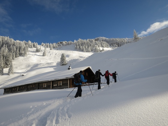 Skitourenausrüstung inkl. vollständiger Notfallausrüstung: LVS, Schaufel, Sonde, Erste-Hilfe-Paket, Biwaksack und Mobiltelefon.