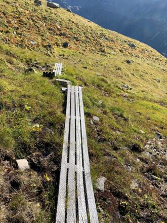 Von der Bushaltestelle Silvretta-Bielerhöhe führt der Wanderweg Richtung Westen durch das Großvermunttal. Leicht erhöht führt der Weg am Ende des Vermuntstausees vorbei, bevor der Anstieg zum Hochmadererjoch erfolgt, leicht bergab verläuft nun der Weg bis zur Tübinger Hütte.