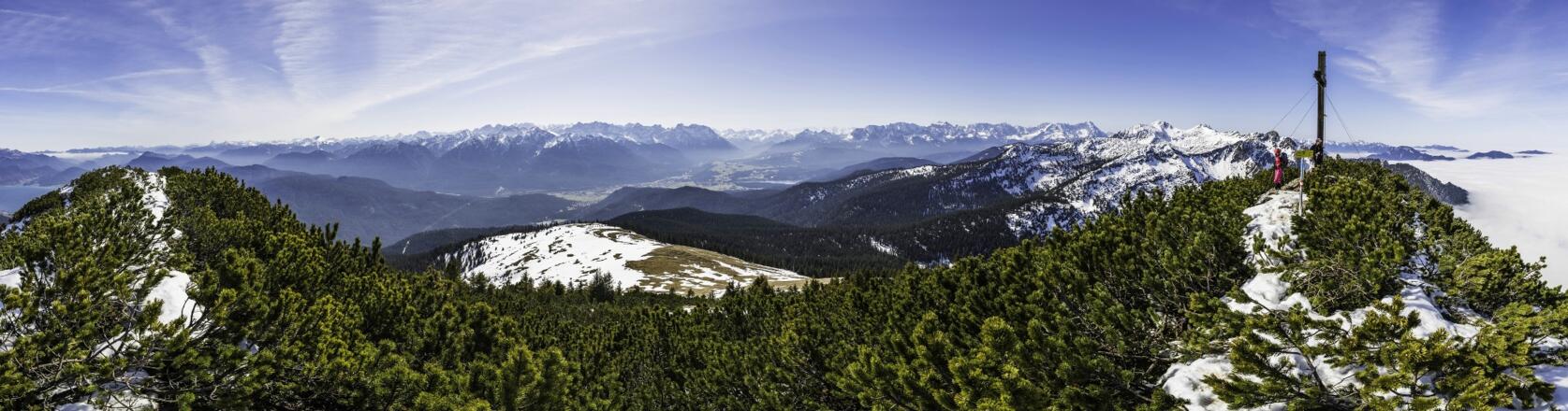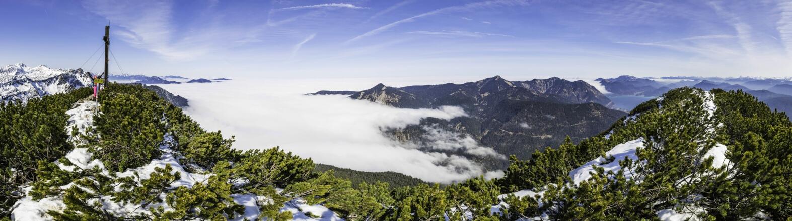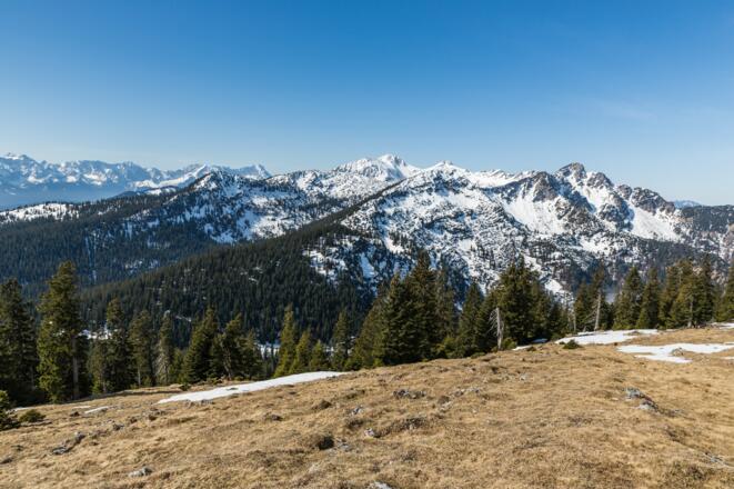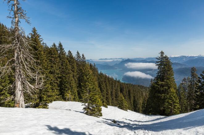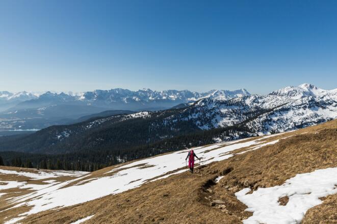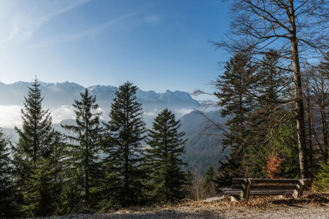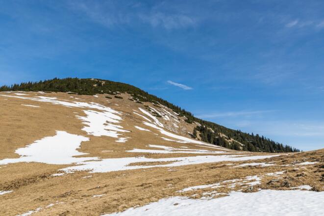 An der nächsten Abzweigung halten wir uns links und nehmen die Forststraße in Richtung Simetsberg. Einen knappen Kilometer später kommt die nächste Abzweigung nach rechts (hier kommen wir später wieder runter), wir folgen aber der Ausschilderung zum Krottenkopf nach links. Der Weg wird nun merklich schmäler und führt uns bald an einer Lichtung entlang in Richtung Neugläger Alm; auf dem nächsten Sattel halten wir uns aber rechts und folgen der Ausschilderung nach Eschenlohe. Diese bringt uns durch lichten Mischwald und über eine kleine Hochebene auf die Nordwestseite des Simetsberg (orange Markierungen an den Bäumen).