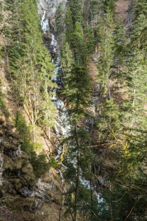 Vom Parkplatz aus überqueren wir die Straße und folgen dem Fahrradweg in Richtung Walchensee bis zur nächsten Brücke. Hier überqueren wir den Obernachkanal und wandern die Forststraße entlang in den Wald hinein. Nach einem knappen Kilometer biegen wir links ab, überqueren den Schwarzenbach auf einer kleinen Brücke und folgen dem neu angelegten Weg hinauf zum Wasserfall. In steilen Serpentinen gewinnen wir schnell an Höhe, können unterwegs zwei schöne Wasserfälle bestaunen und erreichen bald einen kleinen Forstweg. Diesem folgen wir nach links für ein paar Meter leicht bergab und halten uns an der ersten Abzweigung wieder rechts hinauf.