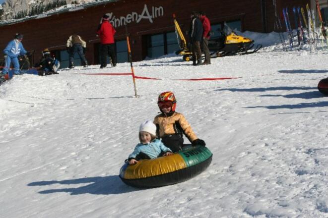 Snowtubing bedeutet: in großen Gummireifen die Bahn hinunter! Neben der Sonnenalm auf der Kampenwand wird jeden Winter eine gut gesicherte, 60 m lange Tubingbahn präpariert. So können sich Kinder und Erwachsene kostenlos einen der großen Gummireifen ausleihen und unbedenklich die Bahn runterschlittern.