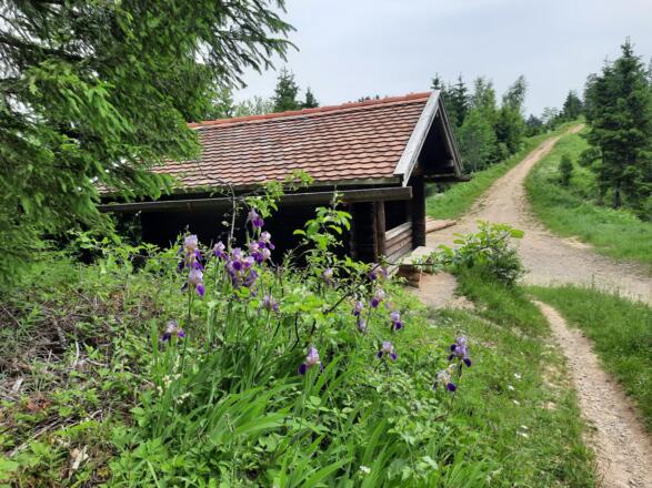 An der Schutzhütte in östlicher Richtung einen kleinen Anstieg hoch. Hier gibt es einen wunderbaren Blick ins Voralpenland, Schweizer Berge und ins württembergische Allgäu.