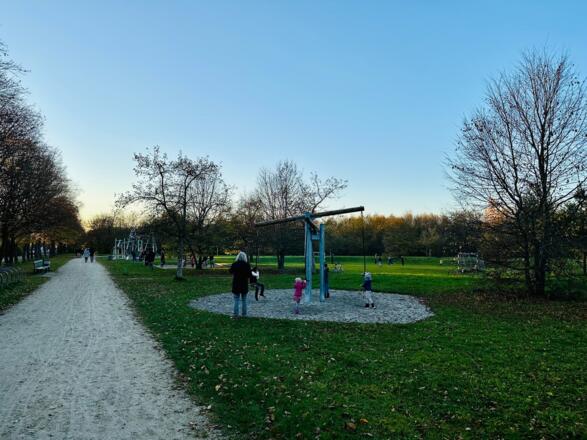 Kletter-, Schaukel und Wippmöglichkeiten für Kinder umrandet von viel Grün im Riemer Park. Der Spielplatz befindet sich zwischen der Messestadt und Gronsdorf.