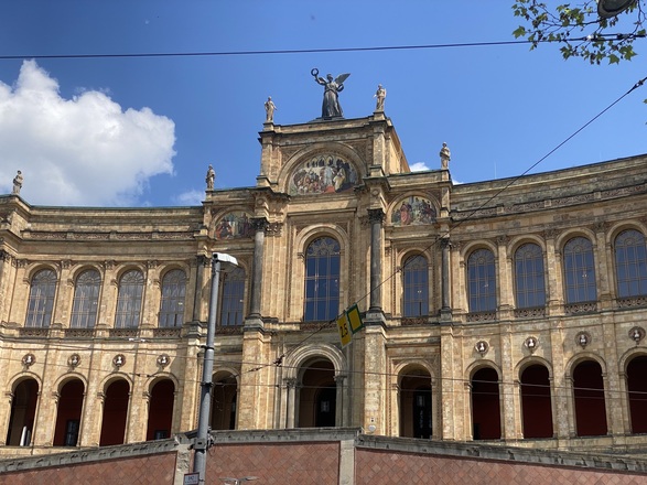 Erfrischt geht es nun zum Maximilianeum und achte hierbei auf die Statue auf der Brücke: das ist Göttin Athene. Und auf dem Gebäude des Maximilianeums thront die 4,5m große Siegesgöttin Nike. Wow so viel Frauenpower! Hättest du das gewusst?