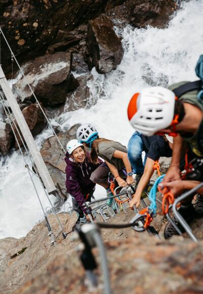 Der Arlberger Winterklettersteig ist ein besonderes, anspruchsvolles Erlebnis. Hier eine der mit D bewerteten Schlüsselstellen.