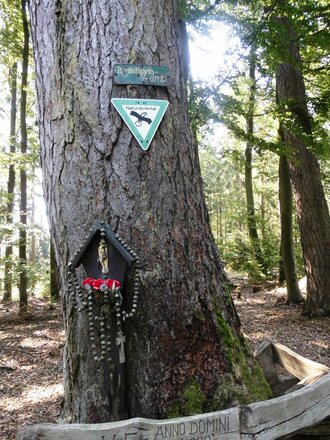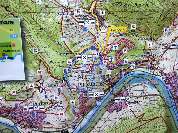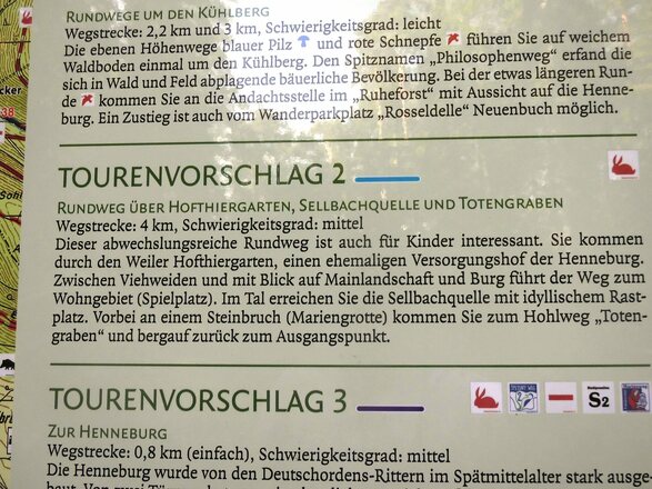 Ausgehend von der Wandertafel des Naturparks Spessart am Parkplatz Ruheforst führt der Weg direkt nach dem Überqueren der Ortsverbindungsstraße Stadtprozelten– Neuenbuch rechts weiter, bis nach einer kleinen Lichtung der „Altenbucher Kirchweg“ gemeinsam mit unserem Weg nach links durch den „Totengraben“ abzweigt. Nach dem Durchqueren des Totengrabens erreichen wir einen Wegweiser „Totengraben“ und der Weg führt weiter Richtung Dorfprozelten. An dieser Stelle queren wir auch den „Spessartweg 2“ und erreichen nach weiteren ca. 700 Metern den Wegweiser Sellbrunn mit dem Rast- und Grillplatz "Sellgrund" der gleichzeitig der tiefste Punkt unserer Wanderung ist. Weiter geht es ca. 100 Meter gemeinsam mit S3 nach links, wo wir dann wiederum nach links immer leicht bergauf in Richtung eines Spielplatzes laufen, den wir rechts des Weges nach dem Austritt aus dem Wald sehen. Jetzt laufen wir kurz zwischen den Häusern bis zur Ortsverbindungsstraße Stadtprozelten - Neuenbuch, die direkt überschritten wird, um weiter bis zum Hofthiergarten zu gelangen. Auf diesem Teilstück des Weges hat man einen weiten Blick über das Maintal und rückwärts gerichtet in den Odenwald mit Boxtal und einem Teil der Felder von Rauenberg. Im Hofthiergarten besteht zur Zeit nur an Wochenenden eine Einkehrmöglichkeit. Mit dem Erreichen des Wegweisers Hofthiergarten wenden wir uns nach rechts und gehen gemeinsam mit dem Spessartweg 2, dem Fränkischen Marienweg und dem Europäischen Fernwanderweg 8 auf der Teerstraße bergauf ca. 150 Meter weiter bis der Weg wieder nach rechts abbiegt und durch eine Viehweide führt. Hier bleiben wir bis zur nächsten Weggabelung und verlassen jetzt aber den Weg nach links zu unserem Ausgangspunkt.