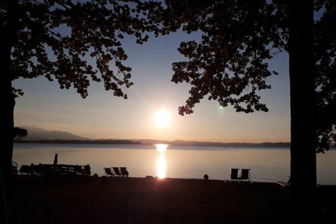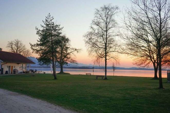 Die Beachbar ist bekannt für chillige Abende, mit einem sagenhaften Blick auf den Sonnenuntergang am gegenüberliegenden Chiemsee-Ufer.