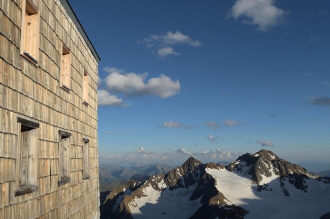Der Abstieg über Geröll, Schnee und endlose, einst vom mittlerweile weitgehend verschwundenen Gaiswandferner glattgeschliffene Felsen ist grandios. Einzelne Markierungen geben grob die Richtung vor, doch die rauen Felsrücken laden geradezu ein, sich selbst einen Weg zu suchen – und dabei die großartige Kulisse mit dem Übeltalferner und den in den letzten Jahren freigelegten Flächen mit Moränen und Seen, die in unterschiedlichen Farben heraufleuchten, zu bewundern. Ein eindrucksvoller Abstieg durch eine faszinierende Hochgebirgslandschaft mit einem Nachteil: Man muss sich jeden verlorenen Höhenmeter beim Anstieg zum Becherhaus wieder hart erarbeiten. Die Hütte thront auf dem Gipfel des Bechers hoch über den ausgedehnten Gletscherfeldern des Übeltalferners und der Weg dorthin ist lang und mühsam. Vor allem das Finale von dem Gletscherbecken unter dem Wilden Freiger hat es in sich. Rund 400 anstrengende Höhenmeter sind zu bewältigen, bis man endlich einen der schönsten Hüttenstandorte der Alpen erreicht – und oben auf der Sonnenterrasse glücklich seinen Durst stillt.