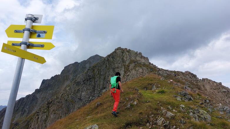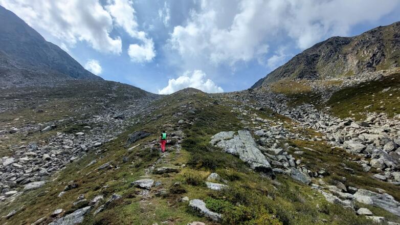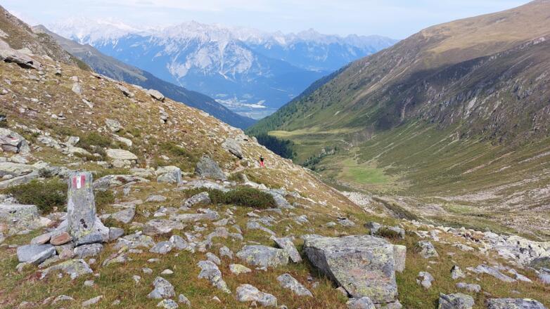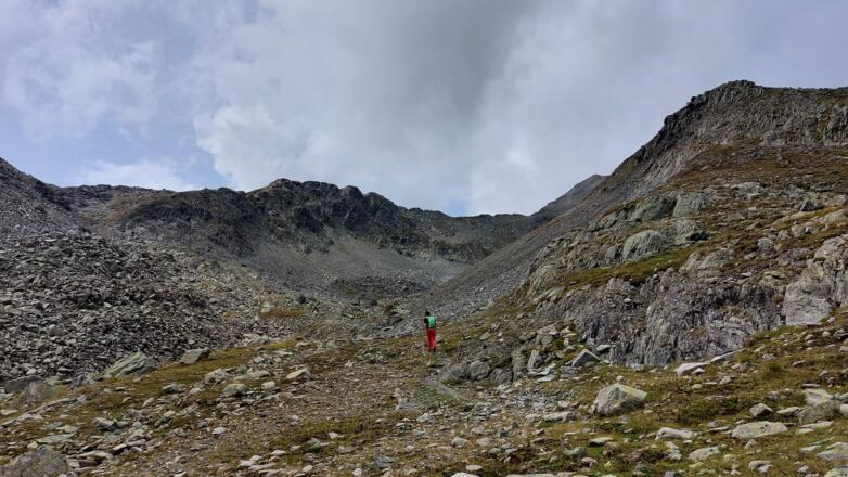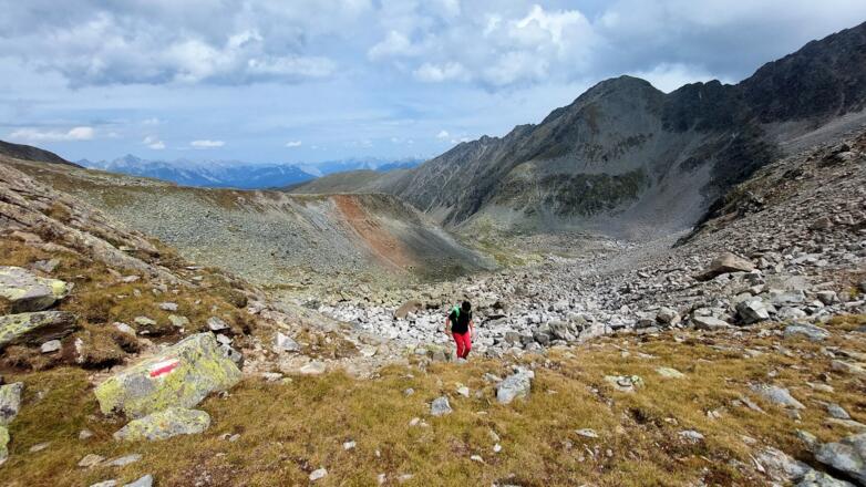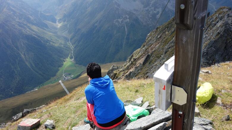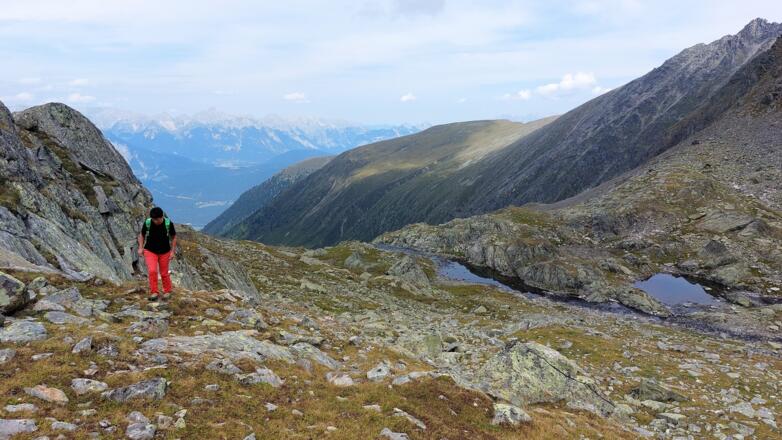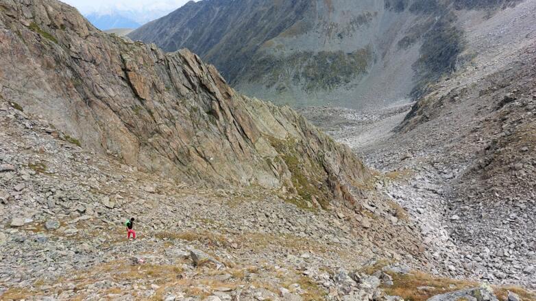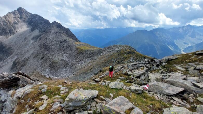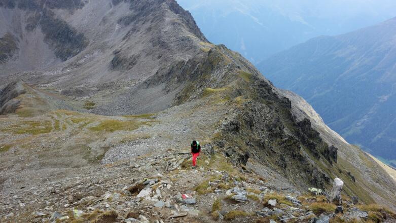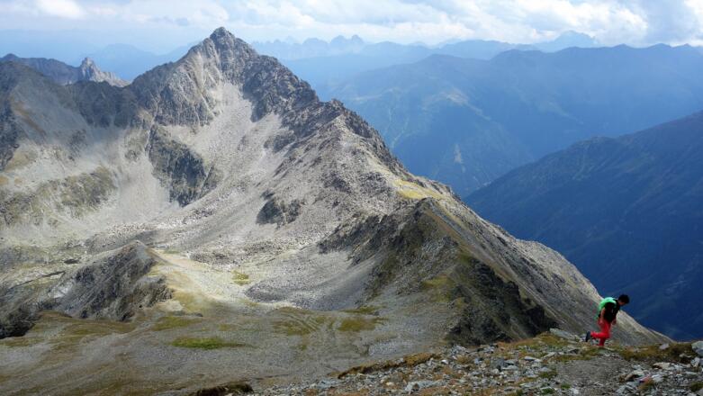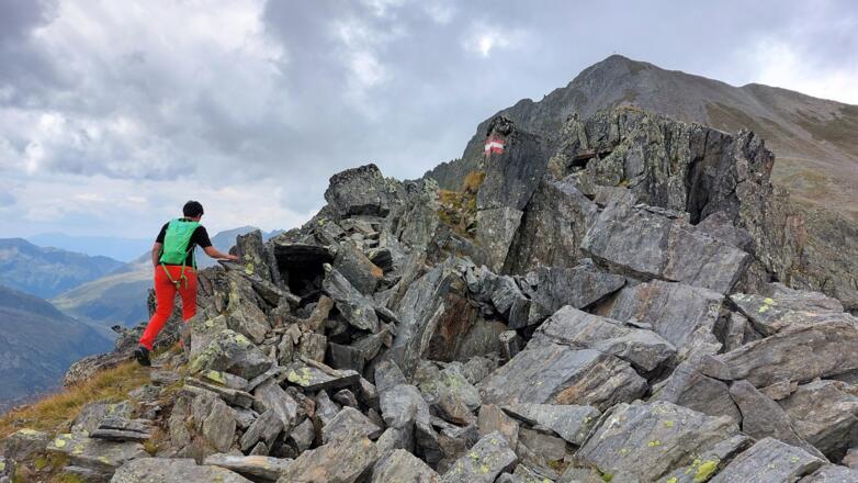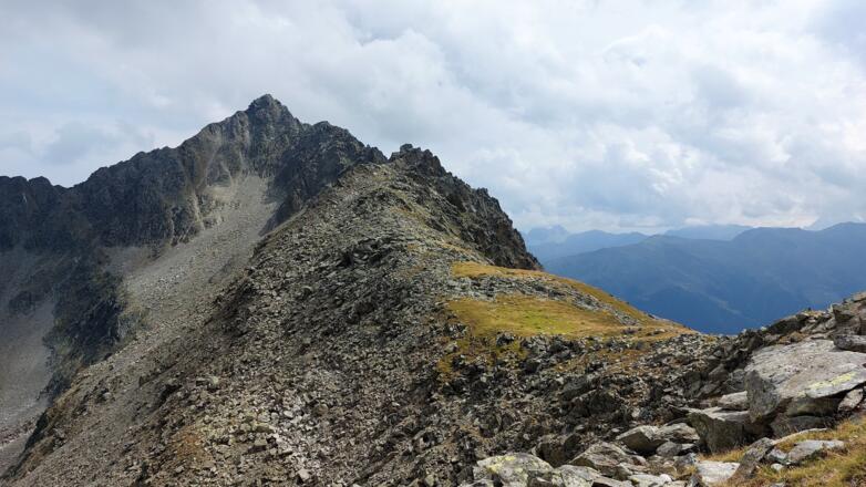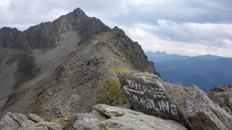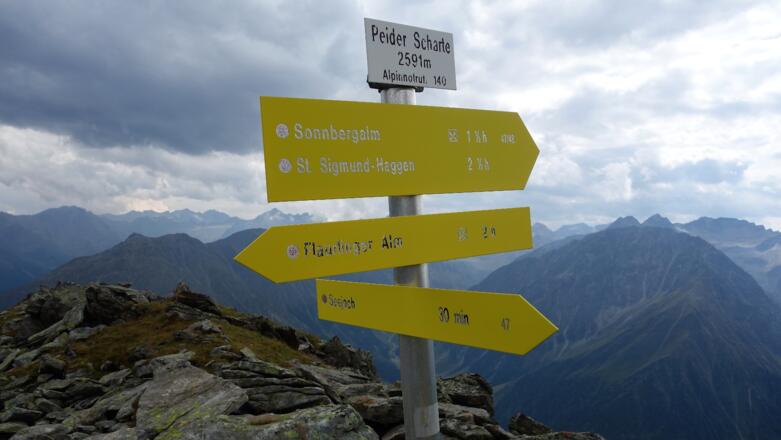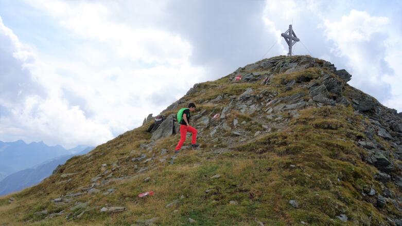 Der Weiterweg zur Peiderscharte ist ebenfalls markiert und durch das zunehmend blockige Gelände gelangen wir nach ca. 1 weiteren Stunde auf die Peiderscharte (2591m), wo wir auf den Anstieg, der vom Kühtai herauf führt, treffen. Wir folgen den Wegweisern nach Westen dem Grat entlang in ca. 1/2 Stunde zum Gipfel. Dabei kommen bei einer kurzen unschwierigen Kletterstelle die Hände zum Einsatz, bevor das letzte, schottrige Stück am breiten Gratrücken überwunden wird.