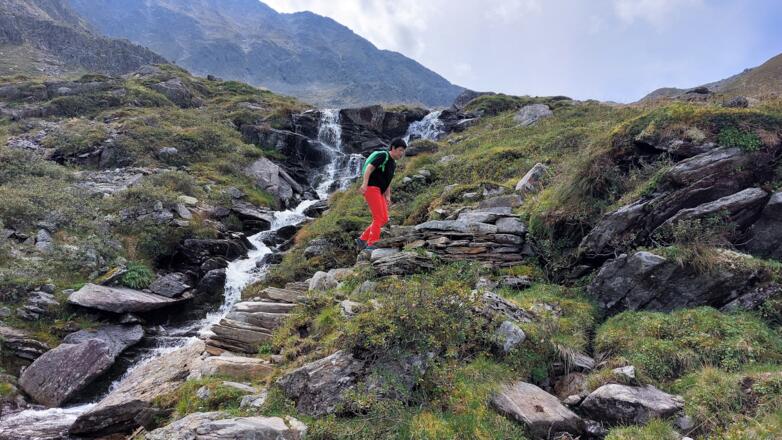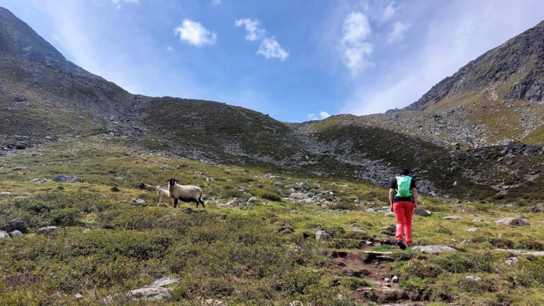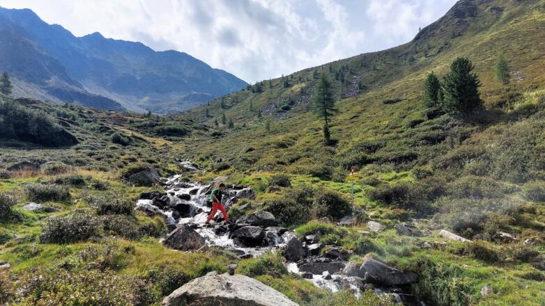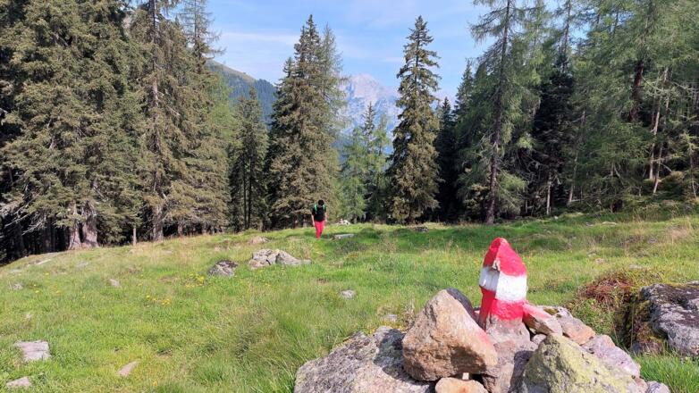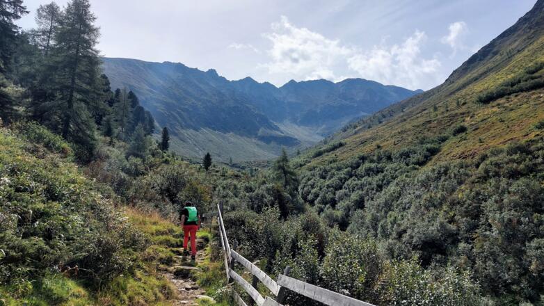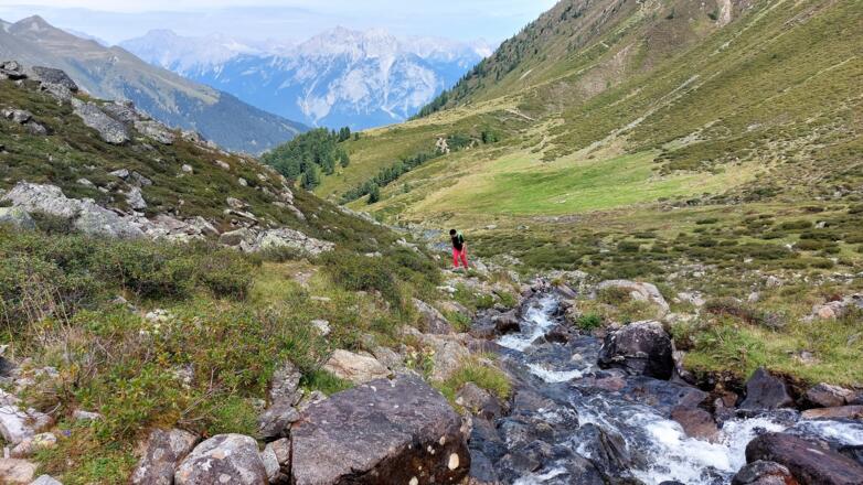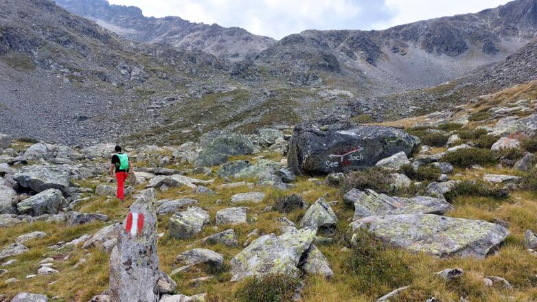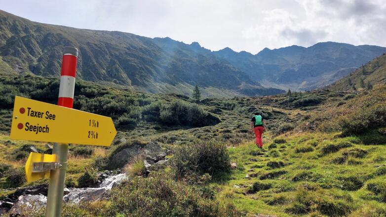 Zuerst müssen wir zur Flaurlinger Alm (1614 m) gelangen: die 8,2 km und steilen 950 hm werden idealerweise mit dem (E-)MTB oder mit dem Auto (Fahrverbotsschild) bewältigt. Dann geht es durch das Seetal ca. 600 hm zum Taxersee und weitere 600 hm auf den Gipfel des Seejochs (auch "Flaurlinger Roßkogel" genannt).