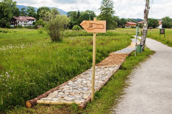 Entlang des Sees verläuft auch ein Barfußpacours, bei dem Alt und Jung die unterschiedlichsten Untergründe mit den Füßen erkunden können.