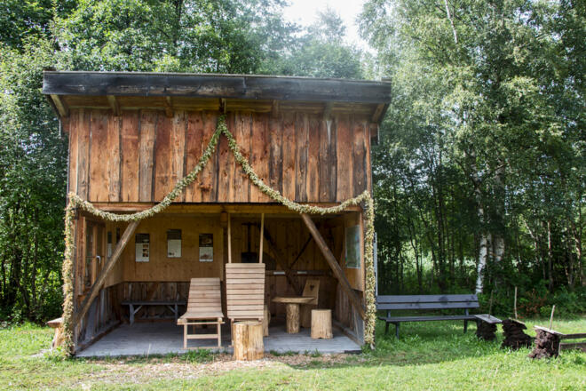 Nun kommen Sie am Moorlehrpfad Bad Kohlgrub an. Hier erfahren Sie einiges über die Besonderheit unseres wertvollen Heilmoores und ein kleiner Weiher mit Liege lädt zum Entspannen ein.