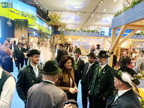 Zu den vielen Gesprächspartnern auf der Grünen Woche zählte auch Bayerns Landwirtschafts- und Tourismusministerin Michaela Kaniber, unsere Aufnahme zeigt sie in der Bayernhalle mit den Trachtenverantwortlichen des Gauverbandes I und der drei Traunsteiner Vereine von links Andreas Klauser (Traunstein), Alfred Prosser (Hochberg), Michael Hauser (Gauvorstand), Simon Schreiber (Festleiter), Sepp Kaiser (3. Bürgermeister und Mitglied der Trauntaler), Franz Maier (Rettenbach) und Julian Heigenhauser (Hochberg).