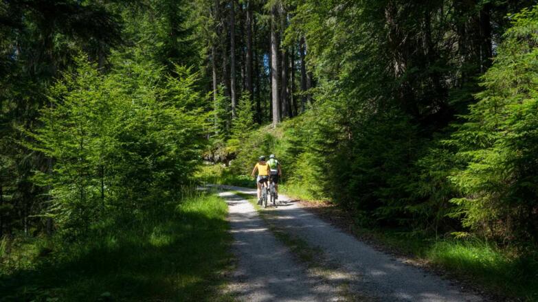 Den Startpunkt bei der Triendlsäge erreicht man direkt und gemütlich von Seefeld, man kann aber auch bequem mit dem eigenen Auto zufahren (Parkplatz nur für Restaurantgäste). Beim alten Sägewerk schwingt man sich motiviert in den Sattel und radelt am asphaltierten Triendlweg entspannt bergab Richtung Scharnitz. An der Abzweigung Lehenwald links auf den Waldweg wechseln und weiter bis zur nächsten Kehre. Dort eine scharfe Linkskurve nehmen und oberhalb des Hinweges durch den Bauernwald (Weg Nr. 19) bis zur Bushaltestelle Unterkelle in Neuleutasch (rechts halten).