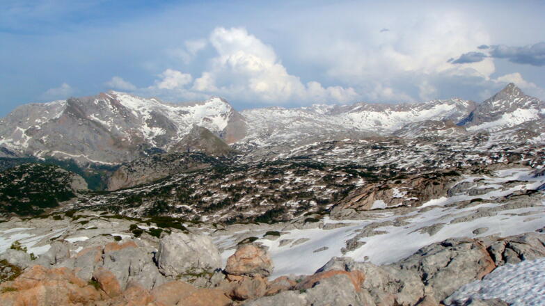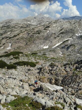 Ein schöner Übergang zwischen zwei Alpenvereinshütten im Steinernen Meer. Der Weg führt erst durch die grüne Berglandschaft und dann auf der anderen Seite der Weißbachlscharte (2261m) durch das beeindruckende Felsszenario nach dem die Gebirgsgruppe benannt ist.