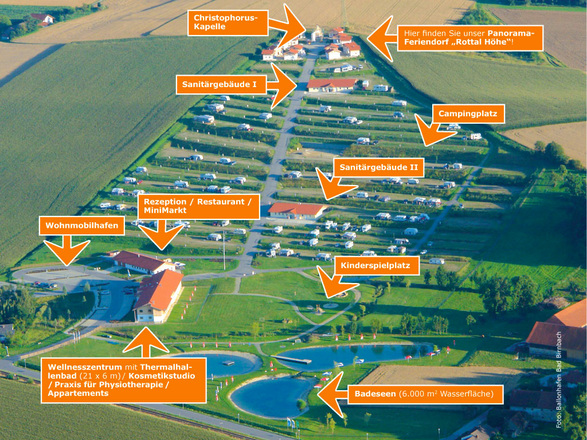 Neu im Rottaler Bäderdreieck ist unser Panorama-Feriendorf "Rottal Höhe", idyllisch über dem Campingplatz gelegen. 14 Ferienhäuser gruppieren sich zu einem charmanten Dorf mit eigener Kapelle. Erholung pur verspricht unser Wellnesszentrum mit Thermalbad und Saunen. Massagen, Kosmetik und Aktivprogramm erfrischen Körper, Geist und Seele. Naturbadeseen, Gaststube mit Sonnenterrasse, Kinderspielplatz u.v.m. garantieren Urlaubsgenuss für alle Generationen.