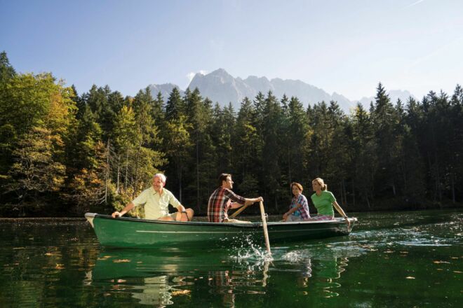 Zur Neuneralm folgst Du der Beschreibung Nr. 9. Bei der Weggabelung kurz unterhalb der Alm hältst Du dich rechts auf dem Wanderweg Richtung Eibsee und Badersee. Im Wald geht es zunächst leicht bergauf, bis sich der Wanderweg zu einem Forstweg verbreitert. Dieser führt in leichtem Gefälle hinunter zur Eibseestraße. Nun geht es bergab (nach rechts) ca. 50 Meter der Straße folgen, bis rechts der Wanderweg zum Badersee bzw. der Törlenweg nach Obergrainau abzweigt. Wer hier direkt nach Obergrainau zurückgehen möchte, hält sich rechts (Teerstraße), überquert die Bahngleise und folgt dem Törlenweg direkt zum Oberen Dorfplatz. Wer zum Badersee möchte, durchwandert eine wunderschöne Allee, bevor er hinter der Wasserreserve nach links in den Wald abbiegt. Im Wald geht es zunächst eben, dann recht steil hinunter, vorbei an den Asphaltstockbahnen („Rentner-Alm“), zum Badersee. Den See erreichst Du beim Bootsanleger des Hotels am Badersee. Bevor Du den Rückweg nach Grainau antrittst, solltest Du unbedingt diesen kleinen Bergsee mit seinem klaren, grünen Wasser umrunden. Für den Rückweg nach Grainau hast Du nun zwei Möglichkeiten. Nach Untergrainau: Ein Stück der Hotelzufahrt folgen, bis rechts der Waldfußweg nach Untergrainau abzweigt. Nach Obergrainau: An der Nordostseite des Sees entlang (Wegweiser Zugspitzbahnhof) und durch den Wald nach Obergrainau, bis Du den Zugspitzbahnhof erreichst. Hier gehst Du links in die Waxensteinstraße und an der nächsten Kreuzung rechts Richtung Grainauer Kurhaus.