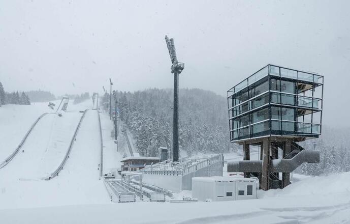 Dem Wanderweg (Nr. 4) in eine Linkskurve folgen und an den Sprungschanzen und Wettkampfanlagen der Seefeld Sports Arena vorbei bis zur Sportalm am Fuße des Gschwandtkopfes. Unterwegs empfiehlt sich hier auch ein kurzer Abstecher auf die Aussichtsplattform am WM-Turm, wo ein hochwertiges Swarovski-Fernglases die funkelnden Bergwelten in fast greifbare Nähe holt.