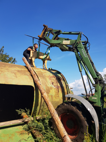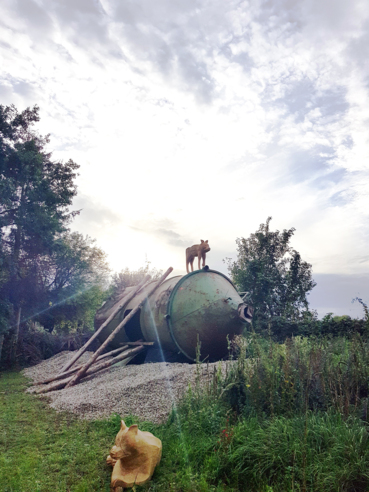 „Wie eine Figur von Oskar Schlemmer, die daliegt und träumt – dieses halbierte Silo da am Eingang zum Garten“, so beschreibt die Künstlerin Karin Fröhlich das Relikt aus dem landwirtschaftlichen Alltag, das am Ortsrand von Weigenhofen bei Lauf an der Pegnitz auf einem Biohofgelände lagert. Umgestürzt und damit verfremdet, weckt das Objekt ganz neue Assoziationen: So fühlen sich einige bei seinem Anblick an eine Rakete erinnert, die, hier abgelegt, auf ihre Verschrottung wartet.